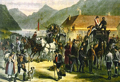 Links: Post- und Schiffs-Station ebgensee-Ischl. etwa 1850 (Fablithographie nach Th. Breidwiser)